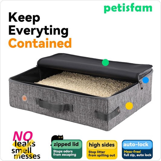 Portable Cat Travel Litter Box with Zipped Lid to Keep Everything Contained. No Odor, Leakage and Messes. Easy to Carry, Clean and Use in Car, Hotel, Aiarplane. (Large, Grey)